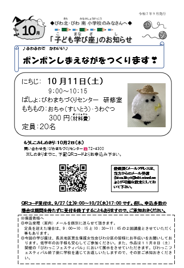 【子ども学び座】10/11♪ふわふわでかわいい♪ ポンポンしまえながをつくります! 満員御礼