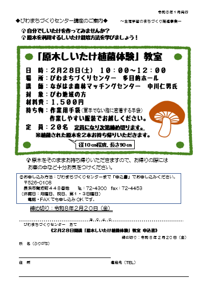 【まちセン講座】2/28 「原木しいたけ植菌体験」教室開催のお知らせ