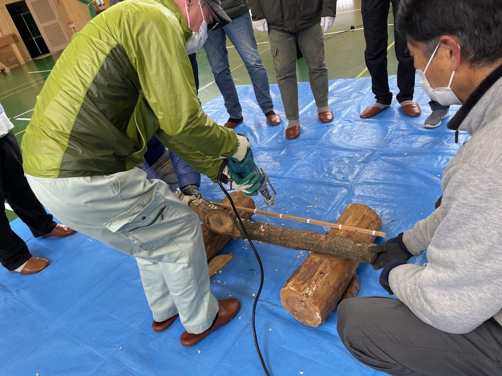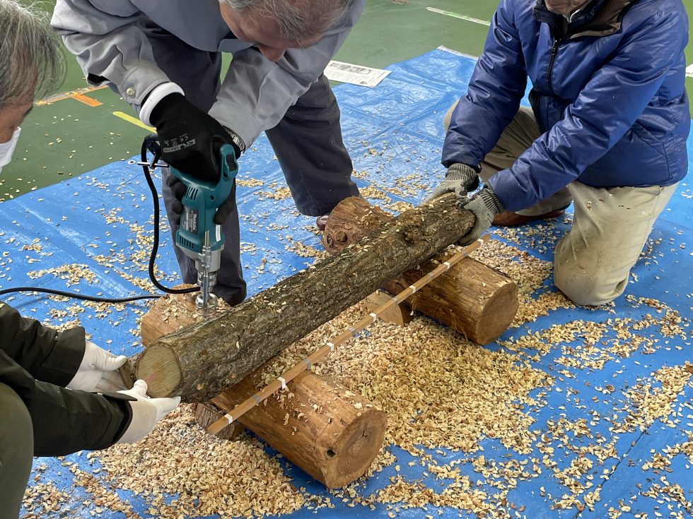原木しいたけ植菌体験開催しました。各戸にチラシ配布させて頂いたら、即お申込みいただき定員になってしまいました。森林マッチングセンター中川さまから、原木の扱い方等を学び、ドリルで穴をあけて菌床を埋め込みしました。今年の秋口には、しいたけが生えてくる?たのしみですね。