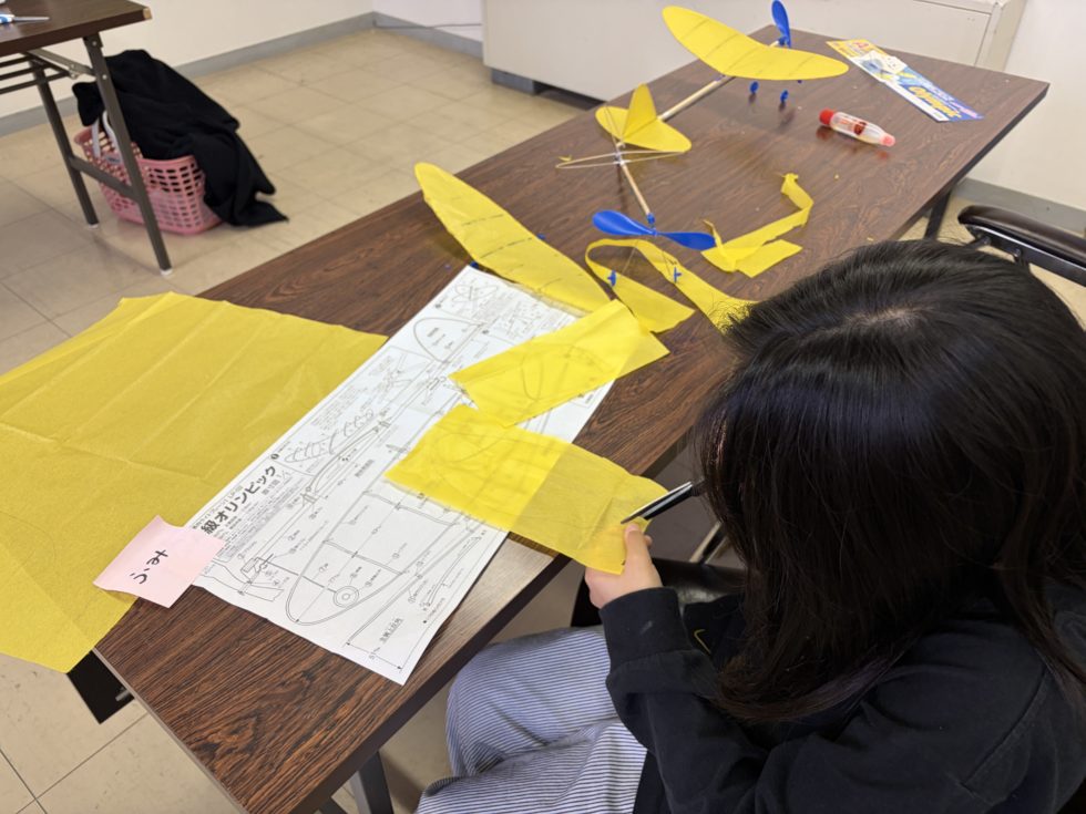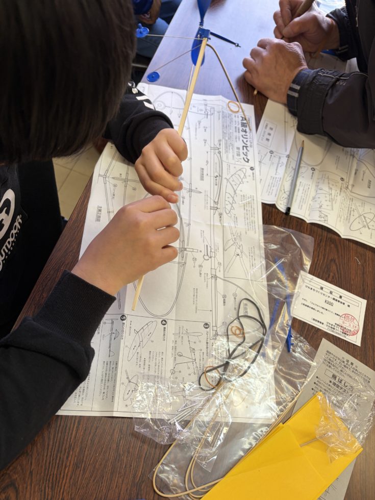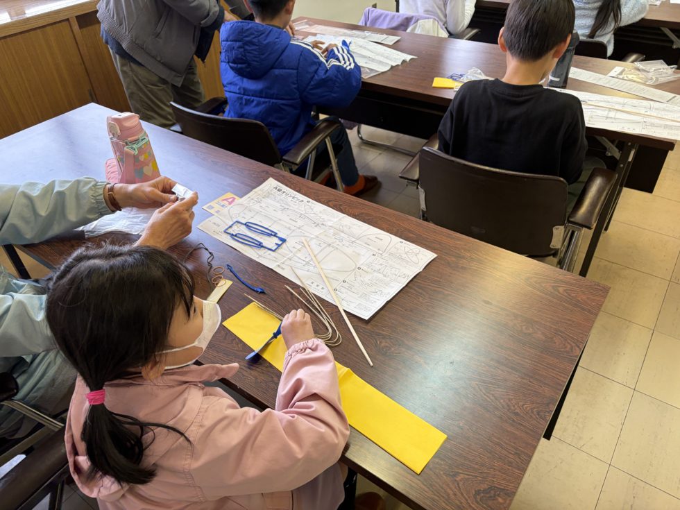 昔懐かしい、ゴムプロペラ飛行機づくりにチャレンジいたしました。サークルキラリびわのメンバーさんの指導で、小学校1年から5年生まで15名の参加です。初日24日は、プロペラ部分と主翼・尾翼の骨組み作成を行いました。これが結構難しい・・・・