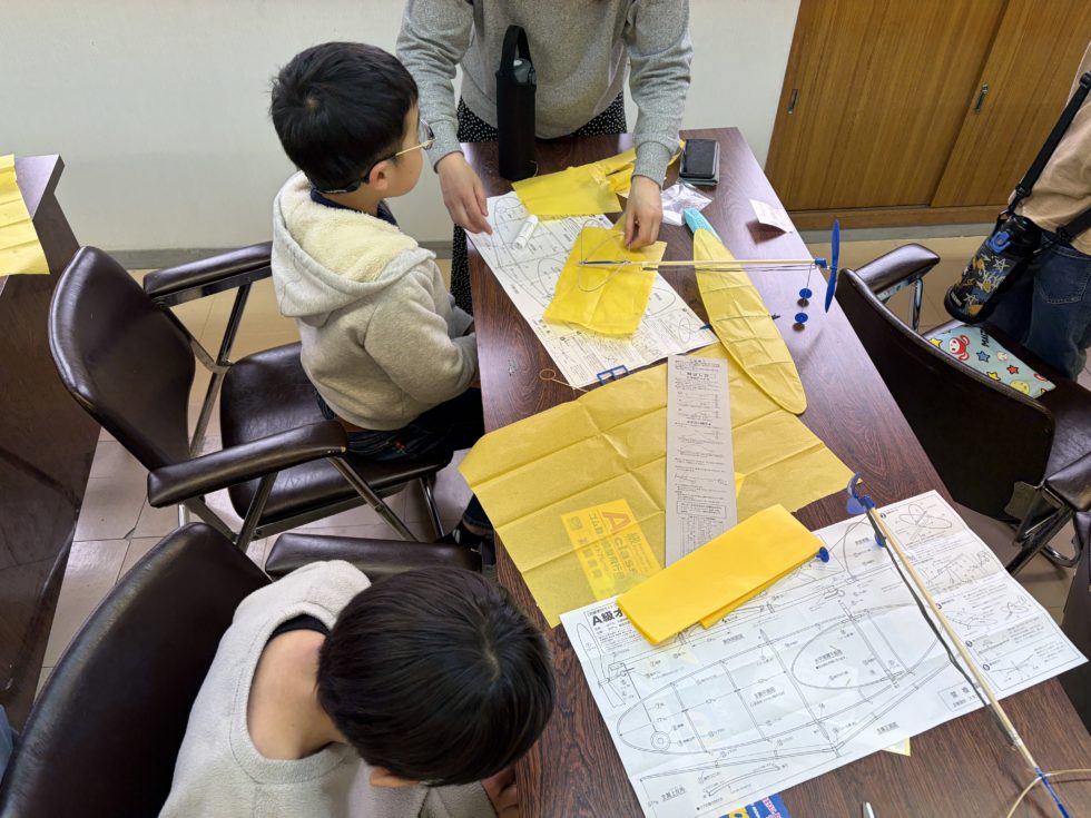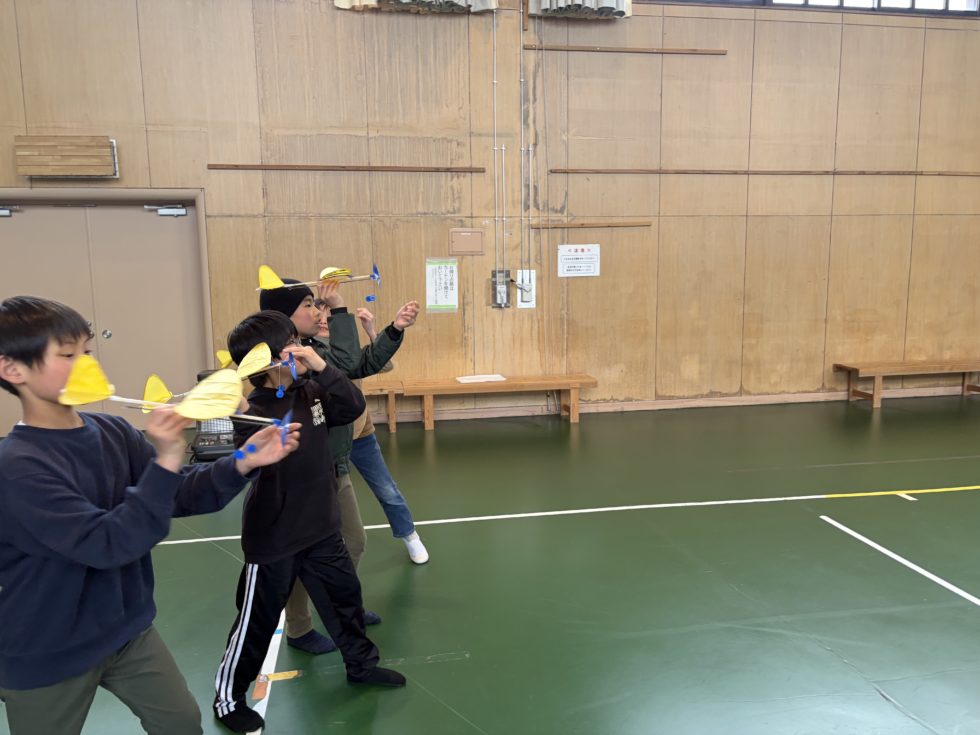 その後、多目的ホールに移動してテスト飛行、これまた羽の位置の調整が難しい・・・・・